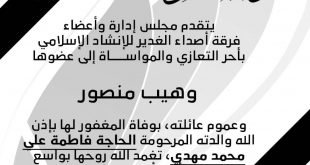 . يتقدم مجلس إدارة وأعضاء فرقة أصداء الغدير للإنشاد الإسلامي بأحر التعازي والمواســــاة إلى عضوها وهيب منصور وعموم عائلته، بوفاة والدته المرحومة الحاجة فاطمة علي محمد مهدي.. تغمد الله روحها بواسع رحمته وألهم أهلها وذويها الصبر والسلوان المصدر
