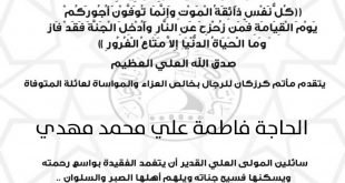 ‘ بسم ٱلله الرَّحْمٰنِ الرَّحِيـمِ {كُلُّ نَفْسٍ ذَآئِقَةُ الْمَوْتِ وَإِنَّمَا تُوَفَّوْنَ أُجُورَكُمْ يَوْمَ الْقِيَامَةِ فَمَن زُحْزِحَ عَنِ النَّارِ وَأُدْخِلَ الْجَنَّةَ فَقَدْ فَازَ وَما الْحَيَاةُ الدُّنْيَا إِلاَّ مَتَاعُ الْغُرُورِ } صدق الله العلي العظيم يتقدم مأتم كرزكان للرجال بخالص العزاء والمواساة لعائلة المتوفاة “المرحومة الحاجة فاطمة علي محمد مهدي” سائلين المولى العلي القدير أن …