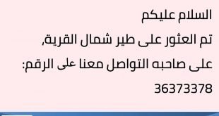 أكمل القراءة »السلام عليكم تم العثور على طير شمال القرية، على صاحبه التواصل معنا على الرقم:363…