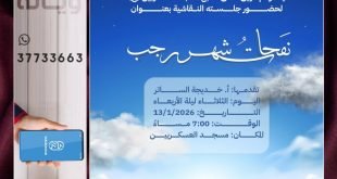 يعلن *فريق خطى* التابع لمسجد العسكريين فعاليته السادسة عشر.. (*نفحات شهر رجب*) 🪻 *اليوم:* يوم الثلاثاء ، ليلة الاربعاء 🪻 *التاريخ:* 13-1-2026 🪻 *الوقت:* 7:00 مساءً 🪻 *المكان:* مسجد العسكريين (ع) 🪻 *تقديم:* أ. خديجة الساتر 🪻 *للاستفسار:* 33790744 ♦️يمكن لذوي الأعذار الدخول للتسجيل :عبر الرابط https://forms.gle/tkXEphdKs37kJju8A 📌 تابعونا عبر: …