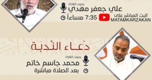 ۩ جۚامۘـ؏ ڪڕزڪٰٱ̍ن …•|【 دعاء كميل&دعاء الندبة 】|•… 📖 *دعاء كميل* 🗓 *٢٠٢١/٧/٢٢* ⏱٠٧:٣٥ مساءاً 🗣 القارئ علي جعفر مهدي 📺 *الـبـث المباشر على قناة* *مـأتـم كـرزكـان للرجـال* http://www.youtube.com/MatamKarzakan/live 📖 *دعاء الندبة* 🗓 *٢٠٢١/٧/٢٣* ⏱ بعد الصلاة مباشرة 🗣 القارئ محمد جاسم خاتم ارسل كلمة اشتراك ليصلك جديدنا واتساب …