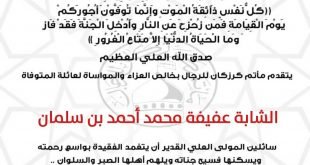 ‘ بسم ٱلله الرَّحْمٰنِ الرَّحِيـمِ {كُلُّ نَفْسٍ ذَآئِقَةُ الْمَوْتِ وَإِنَّمَا تُوَفَّوْنَ أُجُورَكُمْ يَوْمَ الْقِيَامَةِ فَمَن زُحْزِحَ عَنِ النَّارِ وَأُدْخِلَ الْجَنَّةَ فَقَدْ فَازَ وَما الْحَيَاةُ الدُّنْيَا إِلاَّ مَتَاعُ الْغُرُورِ } صدق الله العلي العظيم يتقدم مأتم كرزكان للرجال بخالص العزاء والمواساة لعائلة المرحومة “الشابة عفيفة محمد أحمد بن سلمان ” سائلين المولى العلي القدير …