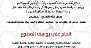 ‘ بسم ٱلله الرَّحْمٰنِ الرَّحِيـمِ {كُلُّ نَفْسٍ ذَآئِقَةُ الْمَوْتِ وَإِنَّمَا تُوَفَّوْنَ أُجُورَكُمْ يَوْمَ الْقِيَامَةِ فَمَن زُحْزِحَ عَنِ النَّارِ وَأُدْخِلَ الْجَنَّةَ فَقَدْ فَازَ وَما الْحَيَاةُ الدُّنْيَا إِلاَّ مَتَاعُ الْغُرُورِ } صدق الله العلي العظيم يتقدم مأتم كرزكان للرجال بخالص العزاء والمواساة لعائلة المرحومة “الحاجة لولوه عيسى المطوع ” سائلين المولى العلي القدير أن يتغمد …