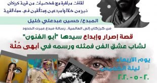 .. كونوا معنا في الحلقة الخامسة عشر من برنامج وجوهـ كرزكانية غدا ليلة الخميس مع المبدع حسين عبدعلي خليل تحت عنوان من كرزكان إلى العالمية.. رسالة مبدع عبرت الحدود.. قصة إصرار وإبداع سيدها “أبو الفنون” لشاب عشق الفن فمثله ورسمه في أبهى حُلَّة.. .. الأربعاء ليلة الخميس في تمام الساعة …