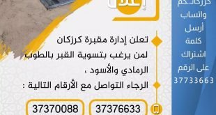 أكمل القراءة »*تعلن* *إدارة مقبرة كرزكان* لمن يرغب بتسوية القبر بالطوب الرمادي والأسود *ال…
