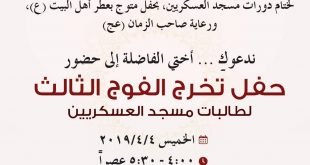 لجنة التعليم الديني للفتاة بمسجد العسكريين تنظم حفل تخريج الفوج الثالث لطالباتها المكلفات المصدر