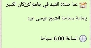 صلاة العيد الساعة 6:00 صباحا اليوم الجمعة بإمامة سماحة الشيخ عيسى عيد في جامع كرزكان الكبير المصدر