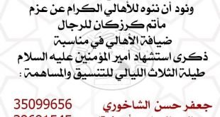 ‘ ۩ ﻣأﭠم ﻛرزﻛٱن .. . نبارك لكم ليالي الشهر الفضيل . و نود ان ننوه للأهالي الكرام عن عزم مأتم كرزكان للرجال ضيافة الأهالي في مناسبة ذكرى إستشهاد أمير المؤمنين عليه السلام طيلة الثلاث الليالي . للتنسيق و المساهمة : . جعفر حسن الشاخوري 35099656 عبدالنبي العباسي أبوفرقان 39691545 …