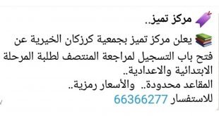 أكمل القراءة ». يعلن مركز تميز بجمعية كرزكان الخيرية عن فتح باب التسجيل لمراجعة المنتصف لطلبة …