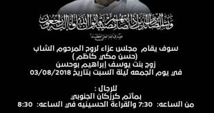 مجلس تأبيني للمرحوم حسن مكي كاظم ليلة السبت القادمة بمأتم كرزكان الجنوبي للرجال وللنساء بمنزل الحاج يوسف إبراهيم بوحسن #تأبين #وفيات_كرزكان #وفيات_الكورة المصدر