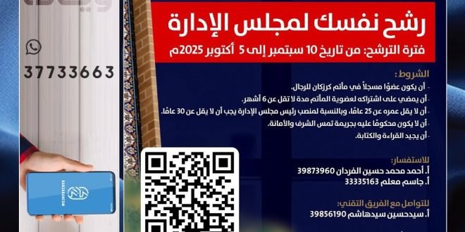 *رشح نفسك لمجلس الإدارة* ☚ *فترة الترشح:* من تاريخ 10 سبتمبر إلى 5 أكتوبر 2025م ⌯ *الشروط:* ❶. أن يكون عضوًا مسجلاً في مأتم كرزكان للرجال. ❷. أن يمضي على اشتراكه لعضوية المأتم مدة لا تقل عن 6 أشھر. ❸. أن لا يقل عمره عن 25 عامًا، وبالنسبة لمنصب رئيس …