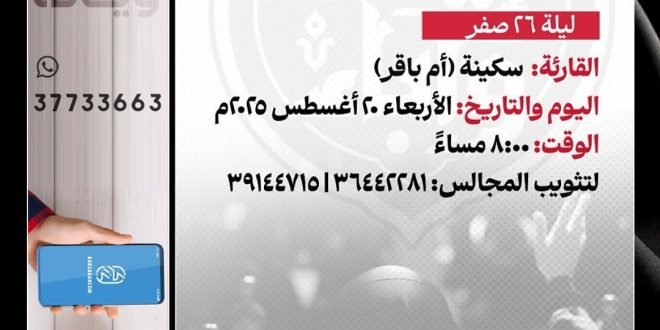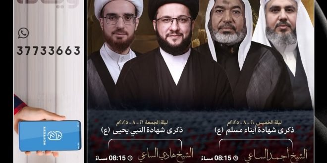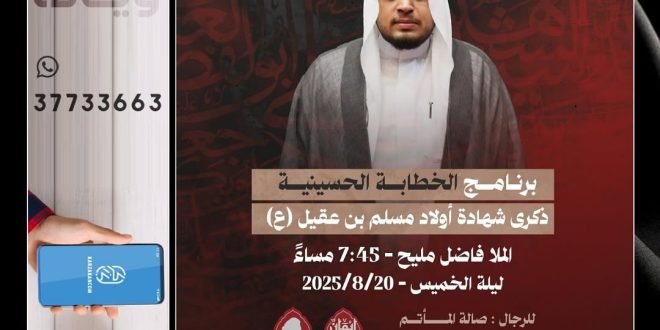 ❞ ذكـــــــــــــرىٰ اســـتشـھـــــاد ،، ❞ أبـنـــاء مـســلـم بن عقـيل ’ع‘ ،، ▓ الخطابة الحسينية █ الشيخ أحمد الساعي ≣ مأتم كرزكان للرجال ▓ ليلة الخميس 20-8-2025 ⌯ 08:15 مساءً ▓ موكب العزاء █ الرادود الحسيني محمد إسماعيل ≣ الإنطلاق من أمام مأتم كرزكان للرجال ▓ ليلة الخميس 20-8-2025 ⌯ 09:15 …