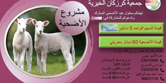 جمعية كرزكان الخيرية تهنئكم بعيد الأضحى المبارك وتدعوكم للمشاركة في مشروع الأضحية . 💸 قيمة السهم الواحد 5 دنانير . 🐑 قيمة الأضحية كاملة 60 دينار . للمشاركة والاستفسار الاتصال ب: عبدالأمير عيسى 33031646 سيد احمد سيد إبراهيم 36651118 مرتضى البصري 33243276 #جمعية_كرزكان_الخيرية #كرزكان #كرزكانكم #أخبار_كرزكانكم #منوعات_كرزكانكم #قريتنا #أخبار_القرية #قريتنا_الحبيبة …