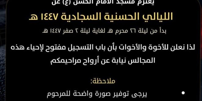 ███ اَﻟسَّـﻟامُـ ﻋَـﻟَﯾْﮑَ ﯾَا أَﺑَا ﻋَﺑْدِ اﻟﻟّٰھ ███ *`•۞( الليالي الحسنية السجادية ١٤٤٧ھ )۞•`* ▓ يعتزم مسجد الإمام الحسن عليه السلام، عن إ ١٤٤٧ھ • بدءًا من ليلة ٢٦ محرم • لـغـــايـة ليلة ٢ صفر لذا نعلن للإخوة والأخوات بأن باب التسجيل مفتوح لإحياء هذه المجالس نيابة عن أرواح مراحيمكم …