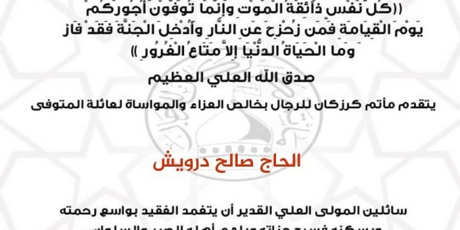 – . . بسم ٱلله الرَّحْمٰنِ الرَّحِيـمِ {كُلُّ نَفْسٍ ذَآئِقَةُ الْمَوْتِ وَإِنَّمَا تُوَفَّوْنَ أُجُورَكُمْ يَوْمَ الْقِيَامَةِ فَمَن زُحْزِحَ عَنِ النَّارِ وَأُدْخِلَ الْجَنَّةَ فَقَدْ فَازَ وَما الْحَيَاةُ الدُّنْيَا إِلاَّ مَتَاعُ الْغُرُورِ } صدق الله العلي العظيم . . يتقدم مأتم كرزكان للرجال بخالص العزاء والمواساة لعائلة المتوفى . . “الحاج صالح درويش” . . …