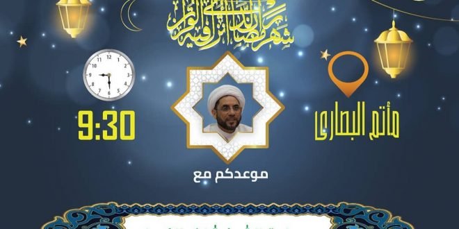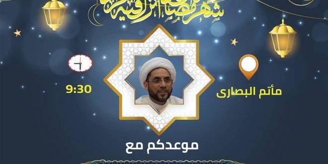 يستضيف مأتم البصارى في ليالي الشهر الكريم ١٤٤٠ هج سماحة الشيخ شاكر الفردان الساعة: 9:30 مساءً المصدر