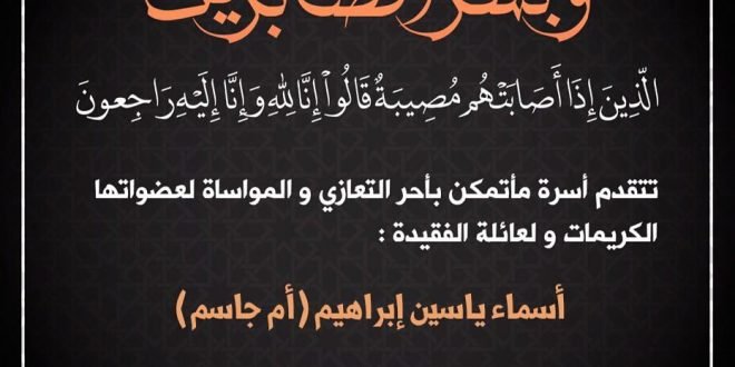 تتقدم إدارة مأتم كرزكان الغربي وجميع منتسبيه بخالص العزاء والمواساة لعائلة الفقيدة المتوفاة الحاجة أسماء ياسين ابراهيم سائلين المولى القدير ان يتغمد الفقيدة بواسع رحمته وان يسكنها فسيح جنته .. إنا لله وإنا إليه لراجعون . . #Bahrain #Karzakan #Matmalgharbi #مأتم_كرزكان_الغربي #كرزكان #البحرين المصدر