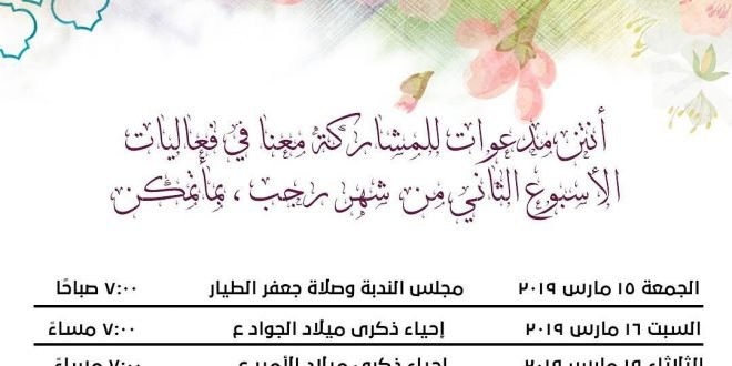 #islambh #karzakkan #karzakan . جدول فعاليات الأسبوع الثاني من شهر #رجب_الأصب . #منتظرات_حتى_الظهور #كرزكان #رجب_١٤٤٠هجرية #أهل_البيت #مناسبات_رجب #مناسبات_دينية المصدر