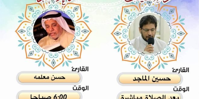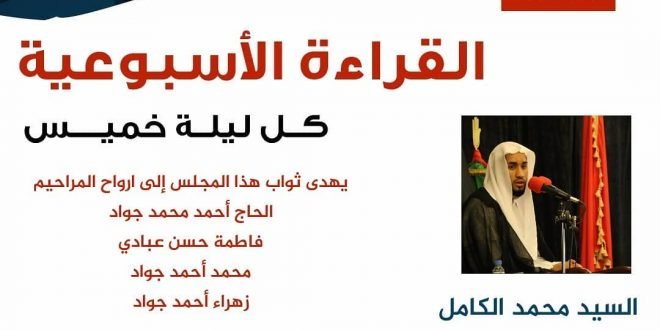 – . . ۩ مأتم كرزكان … . . « القرآءة الأسبوعية» . . *الخطيب* : السيد محمد الكامل *الوقـــت* : 7:30 م . *المكـــان* : مأتم شباب كرزكان *اللــــيلة* : ليلة الخميس *الموافق* : 13/3/2019 . . يهدى ثواب هذا المجلس إلى ارواح المراحيم : . . الحاج أحمد …