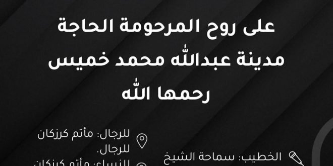 ◼️على روح المرحومة الحاجة مدينة عبدالله محمد خميس الخطيب: سماحة الشيخ حسين الشيخ مهدي الكرزكاني. * للرجال: مأتم كرزكان للرجال. * للنساء: مأتم كرزكان للنساء. الفاتحة المصدر: إنستغرام