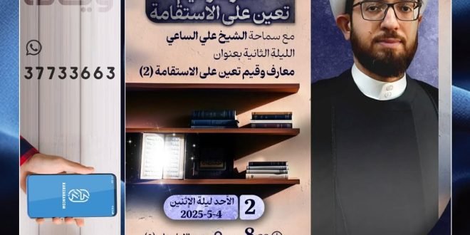 📜 بعنوان: “معارف و قيم تعين على الإستقامة” 🎙️ المحاضر: سماحة الشّيخ علي الساعي 📆 الأحد (ليلة الإثنين) م4/5/2025 ⏰ الوقت 8:30م 📍 المكان: مسجد الإمام علي(ع) 📌ملاحظة: – يوجد بث مباشر |LIVE| و مكان خاص للنساء ۩ التعليم الديني- كرزكان @taleemdk المصدر: إنستغرام