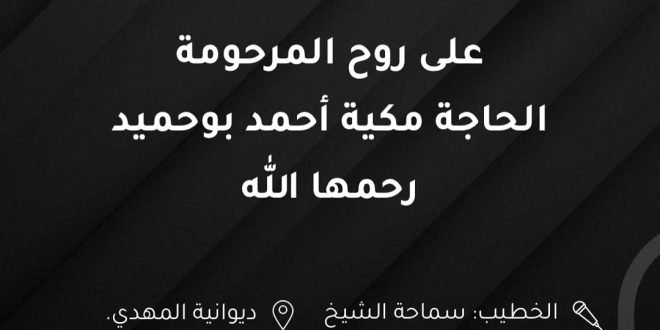 ◼️مجلس تأبيني على روح المرحومة الحاجة مكية أحمد بوحميد (أم أحمد المهدي)، مساء يوم الثلاثاء الموافق 18/3/2025. الخطيب: سماحة الشيخ عيسى بوحميد الوقت: 9:15 مساءً بديوانية المهدي الفاتحة، المصدر: إنستغرام