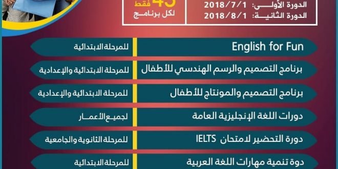 إعلان مدفوع كشكول متميز من الدورات الصيفية نجعل من وقت أبنائكم ممتعـــاً، مسليـــاً ومفيداً 45 دينـار فقط / لكل برنامج – تبدأ الدورات بتاريــــخ: – الدورة الأولـــــى: 2018/7/1 – الدورة الثانيـــة: 2018/8/1 ————————– البرامج: English for Fun للمرحلة الابتدائية برنامج التصميم والرسم الهندسي للأطفال للمرحلة الابتدائية والإعدادية برنامج التصميم والمونتاج …
