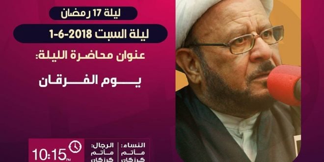الليلة السابعة عشر من برنامج مأتم كرزكان للرجال للشهر الفضيل هذه الليلة مع سماحة الدكتور الشيخ عبدالله الديهي وعنوان المحاضرة: . 《يوم الفرقان》 . تنويه: يوجد مكان خاص للنساء بالملحق الشمالي بمأتم كرزكان للرجال فقط ليلتي 16,17 من شهر رمضان على أن يعود البث المباشر بمأتم كرزكان للنساء بدء من …