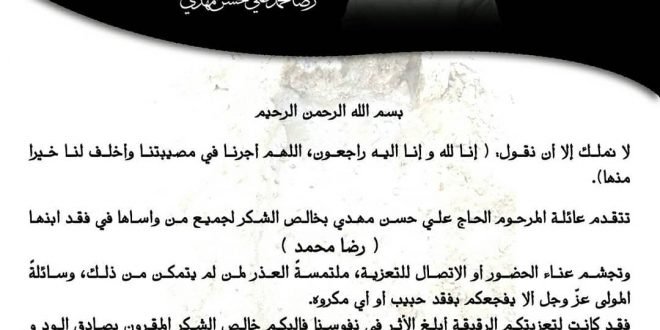 . ◾عائلة المرحوم الحاج علي حسن مهدي تشكر كل من واساها في مصابها #وفيات_كرزكان #كرزكان #كرزكانكم #أخبار_كرزكانكم #منوعات_كرزكانكم #قريتنا #أخبار_القرية #قريتنا_الحبيبة #قرية_كرزكان #أخبار_قرية_كرزكان #قرى_البحرين #مملكة_البحرين #البحرين #بحريننا #bahrain #karzakan #karzakancom #karzakancom_news المصدر