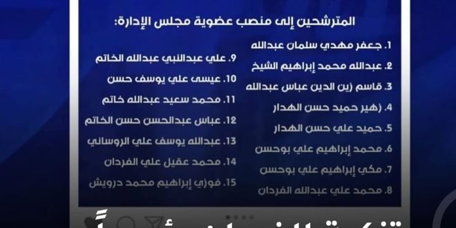 وترشح لمنصب رئيس مجلس الإدارة الرئيس الحالي محمد علي عبدالله الفردان، والذي ستتم تزكيته للرئاسة باعتباره المترشح الوحيد، بينما يتنافس على عضوية مجلس الإدارة 15 مترشحًا بينهم وجوه شابة جديدة تترشح للمرة الأولى. والمترشحون لعضوية الإدارة هم: 1. جعفر مهدي سلمان عبدالله 2. عبدالله محمد إبراهيم الشيخ 3. قاسم زين …