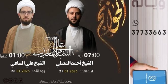 🎙️الشيخ أحمد المصلّي 📆 ليلة الأحد 25-01-2025 🕢 الساعة 7:00 مساءً 🎙️الشيخ علي الساعي 📆 يوم الأحد 26-01-2025 🕢 الساعة 1:00 ظهراً 🔺 يوجد مكان خاص للنساء في ملحق المأتم 🎥 يمكنكم متابعة المجلس في قناة المأتم في اللنك بالبروفايل @matmalgharbi المصدر: إنستغرام