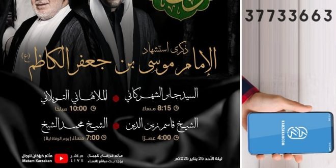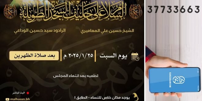 إحياء ذكرى شهادة الإمام موسى الكاظم (ع) اليوم : السبت التاريخ :25.1.2025 الوقت : بعد صلاة الظهرين مباشرة الخطيب : الشيخ حسين علي يعقوب المعاميري الرادود : السيد حسين الوداعي يهدى ثواب هذا المجلس إلى أرواح المرحومين ▪ الرجال : • الحاج عيسى علي محمد • الحاج مكي باقر علي …