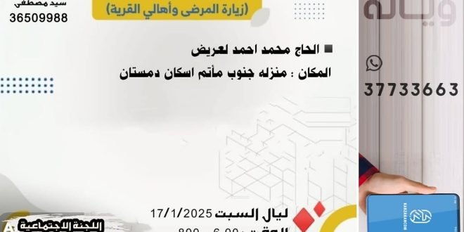 كرزكان – ليلة السبت، 17 يناير 2025 في إطار برنامج التواصل الاجتماعي للجنة الاجتماعية بـ جمعية كرزكان الخيرية، نظمت اللجنة زيارات لأهالي القرية والمرضى ليلة السبت 17 يناير 2025. شملت الزيارات عيادة الحاج محمد أحمد العريض. وقد تميزت الزيارة بالتفاعل الإيجابي والاهتمام الكبير من قبل الأهالي واللجنة. المصدر: إنستغرام