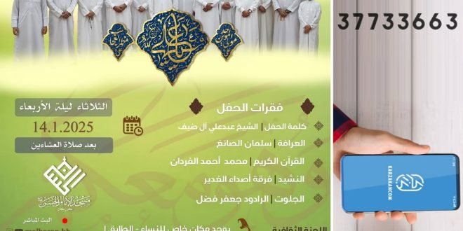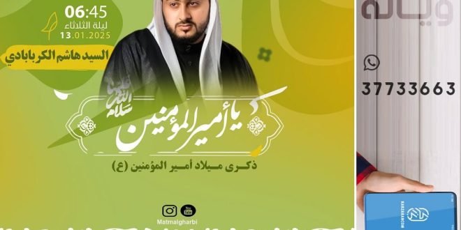 *ذكرى مولد أمير المؤمنين و الجواد عليهما السلام* 🌙 ليلة الإثنين 📅 ١٢ / ١ / ٢٠٢٥ ⏰ الساعة ٧:٠٠ *برنامج الاحتفال* • القرآن أ. جعفر جمعة • الكلمة سماحة الشيخ ناظم التيتون • الشعر أ. عبد اللّٰه القرمزي • الجلوات الرادود فاضل الدرازي • العريف م. زهير أيوب 🔶 …