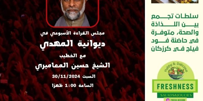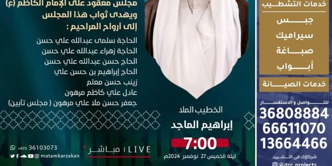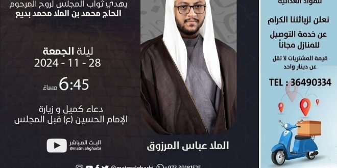 🎙️الملا عباس المرزوق 📆 ليلة الجمعة 28-11-2024 🕢 الساعة 6:45 مساءً 🔺 يوجد مكان خاص للنساء في ملحق المأتم 🎥 يمكنكم متابعة المجلس في قناة المأتم في اللنك بالبروفايل @matmalgharbi ——— الاعلان مركز السقاء للمواد العذائية توصيل مجاني للمنازل 36490334 المصدر: إنستغرام