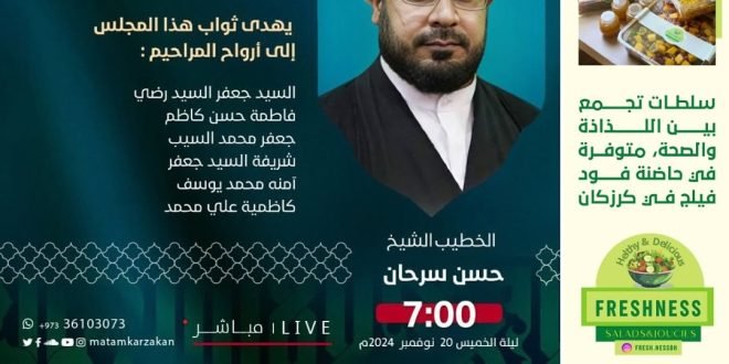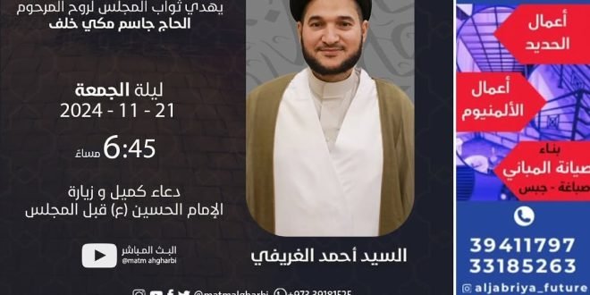 🎙️السيد أحمد الغريفي 📆 ليلة الجمعة 21-11-2024 🕢 الساعة 6:45 مساءً 🔺 يوجد مكان خاص للنساء في ملحق المأتم 🎥 يمكنكم متابعة المجلس في قناة المأتم في اللنك بالبروفايل مأتم كرزكان الغربي @matmalgharbi ———— الاعلان مستقبل الجابرية للتجارة أعمال الحديد أعمال الألمنيوم بناء وصيانة المباني (صباغة وجبس) 39411797 33185263 @aljabriya_future …