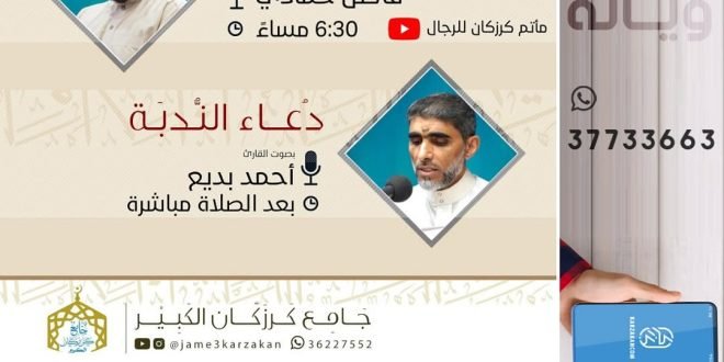 …•|【 دعاء كميل&دعاء الندبة 】|•… 📖 *دعاء كميل* 🗓 *10/10/2024* ⏱6:30 مساءاً 🗣 القارئ فاضل حمادي 📺 *الـبـث المباشر على قناة* *مـأتـم كـرزكـان للرجـال* @matamkarzakan 📖 *دعاء الندبة* 🗓 *11/10/2024* ⏱ بعد صلاة الصبح مباشرة 🗣 القارئ أحمد بديع @jame3karzakan المصدر: إنستغرام
