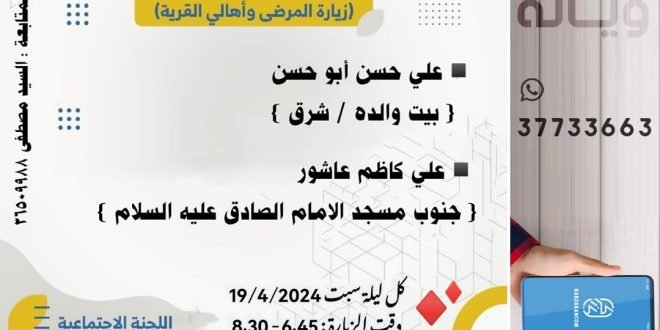 ▪️نتقدم بخالص العزاء لابنة القرية الحاجة أم حسين (ابنة الحاج سلمان الشاخوري) لوفاة عمها، ونتقدم لولديها حسين وحسن السهلاوي بوفاة جدهما: *المرحوم {الحاج حسن علي صالح السهلاوي}* يوم أمس الخميس 18/4/2024 ◾️مجالس التعزية ◾️تبدأ التعزية للرجال من اليوم الجمعة – 19/04/2024 ولغاية يوم الأحد 21/04/2024 ( صباحاً ، عصراً ، …