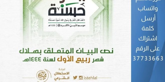 . نص البيان المتعلق بهلال شهر ربيع الأول لسنة 1444 للهجرة: بسم الله الرحمن الرحيم قامت اللجنة بتتبع أخبار الهلال في البحرين وبقيّة المناطق الأخرى مساء هذا اليوم الاثنين (ليلة الثلاثاء)؛ ونظرا لعدم ثبوت رؤية الهلال في أفق المنطقة سواء بالعين المجردة أم بالعين المسلحة، فسيكون يوم غد الثلاثاء هو …