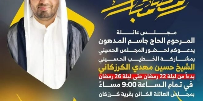 مجلس عائلة المرحوم الحاج جاسم المدهون يدعوكم لحضور المجلس الحسيني بمشاركة الخطيب الحسيني الشيخ حسين مهدي الكرزكاني بدءاً من ليلة ٢٢ إلى ٢٦ رمضان في تمام الساعة ٩:٠٠ مساء ً.. #كرزكان #كرزكانكم #أخبار_كرزكانكم #منوعات_كرزكانكم #قريتنا #أخبار_القرية #قريتنا_الحبيبة #قرية_كرزكان #أخبار_قرية_كرزكان #قرى_البحرين #مملكة_البحرين #البحرين #بحريننا #bahrain #karzakan #karzakancom #karzakancom_news المصدر