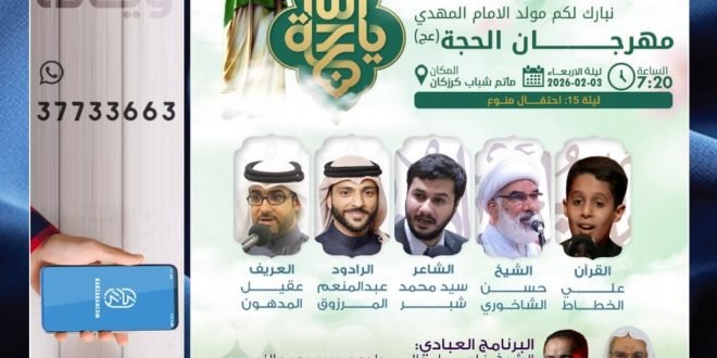 ≣▕ نـبـــــارک لـكــم ذكـــــرىٰ ≣≣ مولـد الإمام المھدي ‘عج’ ≣≣ مـھـــــرجـان الحُجّة ‘عج’ ᪥ ليلة 15: احتفال منوع ❉ العــرافة: عقيل المدهون ❉ القــــرآن: القارئ علي الخطاط ❉ الكلمــــة: الشيخ حسن الشاخوري ❉ الشـــعـر: الشاعر سيّد محمد شبّر ❉ الجلوات: الرادود عبدالمنعم المرزوق ⌕ ليلة الأربعاء 3-2026-2م ⌕ الساعة: 07:20 …