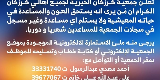 إعلان تعلن جمعية كرزكان الخيرية لجميع أهالي كرزكان الكرام ان مَن يرى انه يستحق العون والمساعدة في حياته المعيشية ولا يستلم اي مساعدة وغير مسجل في سجلات الجمعية للمساعدين شهريا و دوريا.. يرجى منه ملئ الاستمارة الالكترونية على الرابط او كتابة خطاب وتسليمه للموظف بمقر الجمعية او التواصل مع أحمد …