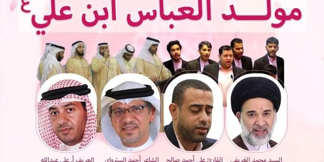 ‘ ▞ ﻣأﭠم ﻛرزﻛٱن ﻟﻟرﺟٱل ❱ نبارك لكم ذكرى ولادة: *💐 العباس ابن علي ‘ع’ 💐* وبهذه المناسبة تقيم *اللجنة الثقافية* برنامجها المنوّع: ↲ العريف: أ. علي عبدالله ↰ القرآن: القارئ علي أحمد صالح ↲ الكلمة: السيد محمد الغريفي ↰ الشعر: الشاعر أحمد الستراوي ↲ الأناشيد: فرقة الرضوان وفرقة نور …