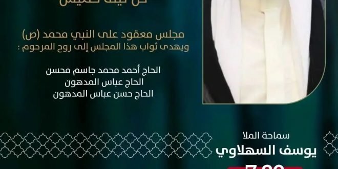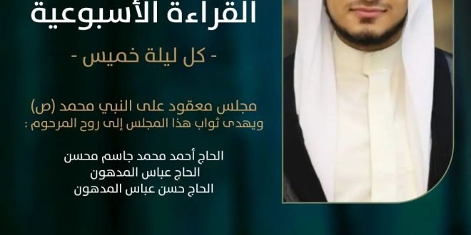 ‘ ▞ ﻣأﭠم ﻛرزﻛٱن ﻟﻟرﺟٱل ⌯ القراءة الأسبوعية ⌯ ↲ الخطيب: الملا يوسف السهلاوي ↰ الـوقـــت: 7:30 مساءََ ↲ اللــــيلـة: ليلة الخميس ↰ المـوافق: 2/3/2022 ❞ مجلس معقود على النبي محمد (ص) ❝ ويهدى ثواب المجلس إلى أرواح المراحيم: ⇽ الحاج أحمد محمد جاسم محسن ⇽ الحاج عباس المدهون ⇽ …
