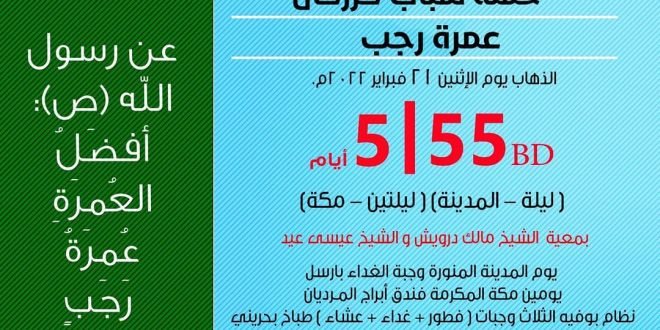 حملة شباب كرزكان بادر بالتسجيل في العمرة الرجبية السريعة 🕋🕋 تفاصيل الرحلة: الذهاب يوم الإثنين 21 فبراير 2022م 5 أيام (ليلة المدينة + ليلتين مكة) 💰 55 دينار للاستفسار: عبدالله النويسي 39862238 أحمد عيسى 39879233 عيسى ربيع 38887223 محمود البناي 36928288 #كرزكان #كرزكانكم #أخبار_كرزكانكم #منوعات_كرزكانكم #قريتنا #أخبار_القرية #قريتنا_الحبيبة #قرية_كرزكان #أخبار_قرية_كرزكان …