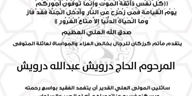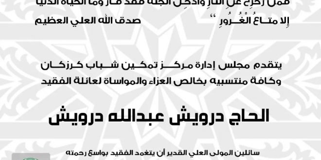 ‘ بسم ٱلله الرَّحْمٰنِ الرَّحِيـمِ {كُلُّ نَفْسٍ ذَآئِقَةُ الْمَوْتِ وَإِنَّمَا تُوَفَّوْنَ أُجُورَكُمْ يَوْمَ الْقِيَامَةِ فَمَن زُحْزِحَ عَنِ النَّارِ وَأُدْخِلَ الْجَنَّةَ فَقَدْ فَازَ وَما الْحَيَاةُ الدُّنْيَا إِلاَّ مَتَاعُ الْغُرُورِ } صدق الله العلي العظيم يتقدم مأتم كرزكان للرجال بخالص العزاء والمواساة لعائلة المتوفى “المرحوم الحاج درويش عبدالله درويش” سائلين المولى العلي القدير أن يتغمد …