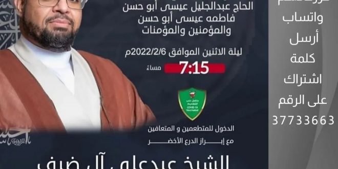 ‘ ۩ مأتم كرزكان .. *« القراءة الأسبوعية »* *الخطيب* : الشيخ عمار الحداد *الـوقـــت* : 7:00 مساءََ *اللــــيلـة* : ليلة الخميس *الموافق : 9/2/2022 مجلس معقود على النبي محمد ص ويھدى ثواب هذا المجلس إلى روح المرحوم : ▪️الحاج أحمد محمد جاسم محسن الفاتحة 📺 *الـبـث المباشر على قناة* …