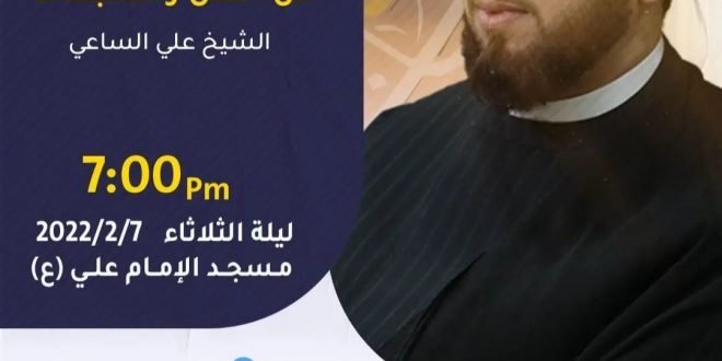 #دعوة الملتقى الشبابي يدعوكم لحضور أولى حلقات الملتقى الشبابي لهذا العام مع *الشيخ علي الساعي* وتحت عنوان *وقاية النفس من الفتن والشبهات* 📆 *ليلة الثلاثاء الموافقة لتاريخ 07-2-2021* ⏰ *الزمان: 7:00 م* 🕌 *المكان: مسجد الإمام علي [ع]* *-الحضور وفقًا للاحترازات الطبية -* كما يوجد بث مباشر عبر برنامج زووم …