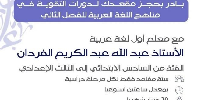 1) بدء التسجيل في دورات التقوية لمناهج اللغة العربية للفصل الثاني للصفوف من 6 الابتدائي و حتى 3 إعدادي مع الاستاذ عبد الله عبد الكريم الفردان،، 2) و ما زال التسجيل مستمرا لبرنامج تحسين و تنمية مهارات القراءة و الكتابة لتلاميذ صعوبات التعلم و المتأخرين دراسيا : التدريس فردي وفق …