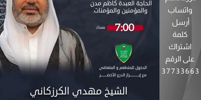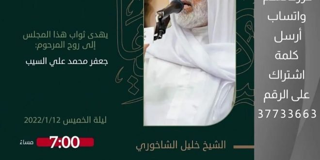 سيقام مجلس حسيني يهدي ثوابه إلى روح المراحيم: ١_الحاج علي أبوحسن. ٢_الحاج إبراهيم أبوحسن. ٣_الحاج خليل أبوحسن. ٤_الحاجة ليلى علي البقالي. ٥_الحاجة العبدة كاظم مدن. وجميع المؤمنين والمؤمنات.. 🎙️الشيخ مهدي الكرزكاني 📆ليلة الثلاثاء الموافق 10_1_2022 ⏳7:00 مساءاً 🕌 مأتم الحسين الشرقي ♦️ملاحظة: الدخول للمتطعمين والمتعافين مع إبراز الدرع الأخضر.. الفاتحة.. …